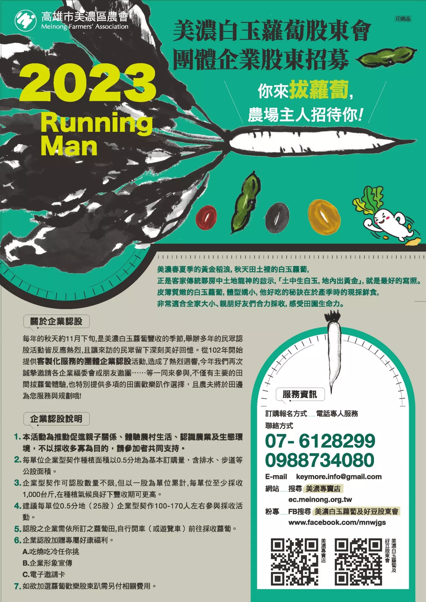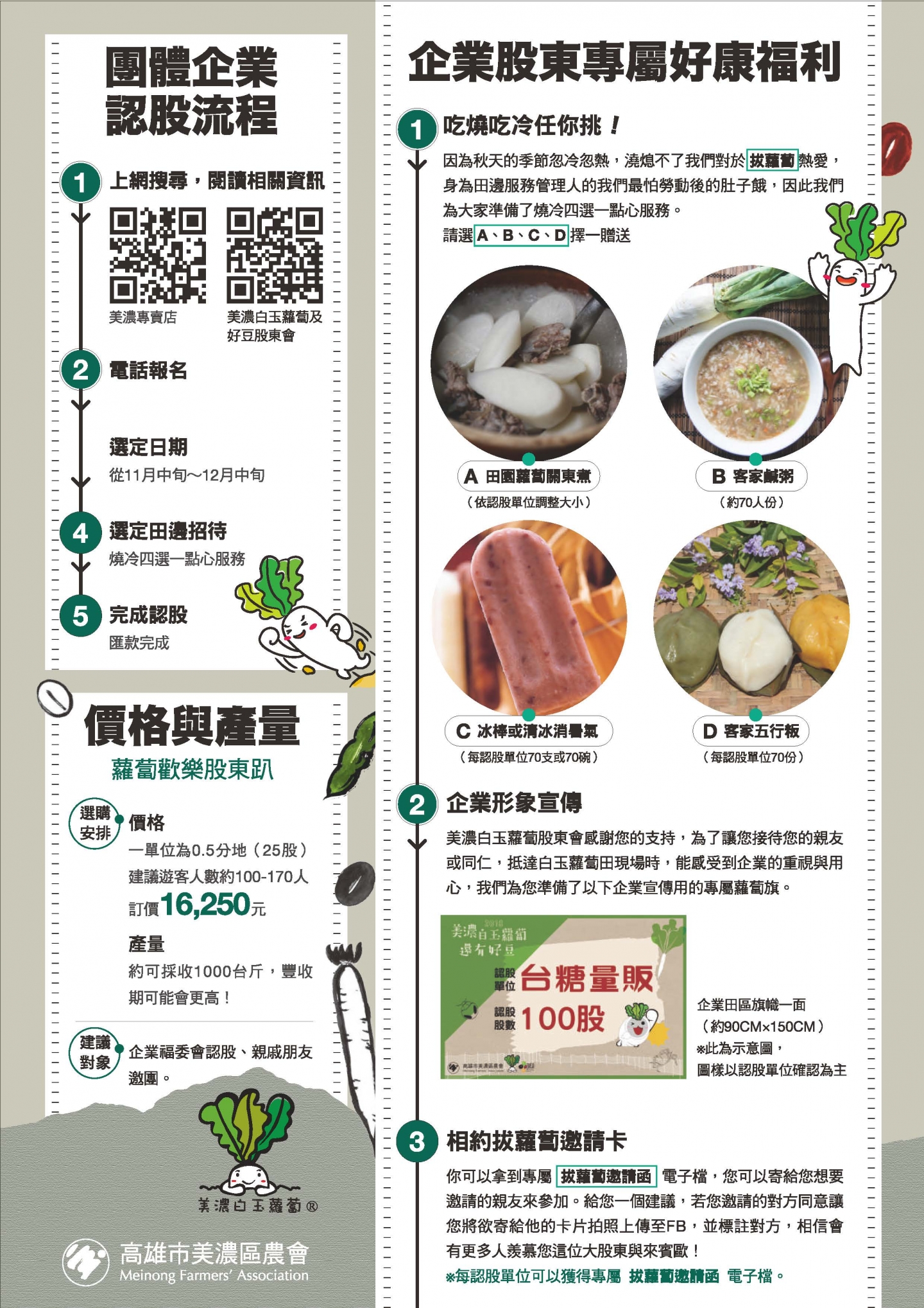 「2023美濃白玉蘿蔔及好豆股東會」團體企業股東招募活動 價格與規劃方式:每單位以0.5分地為基本訂購量,建議人數約100-170人,訂價16,250元 日期:11月中旬-12月下旬 訂購報名方式:電話專人服務,聯絡方式:07-6128299