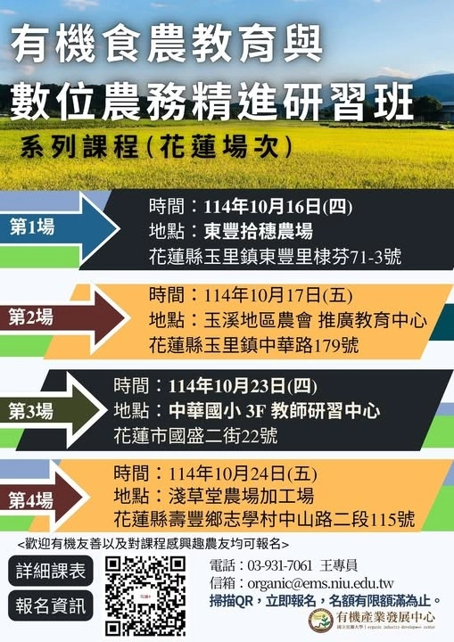 一、本中心訂於114年10月16日 (四)、10月17日 (五)、10月23日(四)及10月24日 (五),於花蓮各區辦理「有機食農教育與數位農務精進研習班」。本研習班結合農場參訪、數位農務、碳足跡及食品冷鏈等實務課程,藉以協助農友加值農場產值,增進整體產業競爭力。