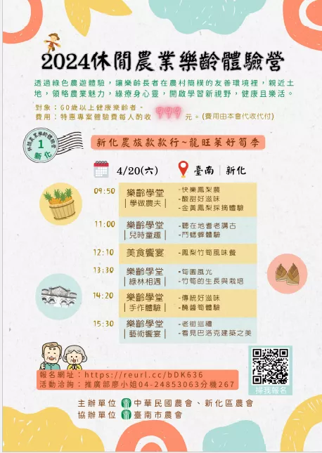 休閒農業樂齡體驗營-新化農旅款款行〜龍旺萊好筍季 活動目的:透過綠色農遊體驗讓樂齡長者親近土地,綠療身心靈。「新化農旅款款行〜龍旺萊好筍季」,結合在地當季特色農業,從產地到餐桌,領略新化農業魅力。 參加對象、人數及費用:60歲以上健康樂齡者,35人為限,本會代收學員部份負擔費用每人999元。 報名方式:線上報名:https://reurl.cc/bDK636,額滿為止。