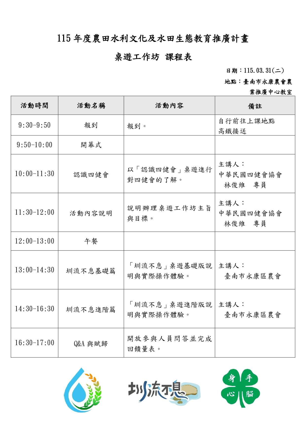 二、本活動時間為115年3月31日(二)上午09時30分假臺南市永康區農會農業推廣中心教室(710臺南市永康區中山南路635號)舉行,活動配合款新臺幣500元整,錄取後現場繳納。
