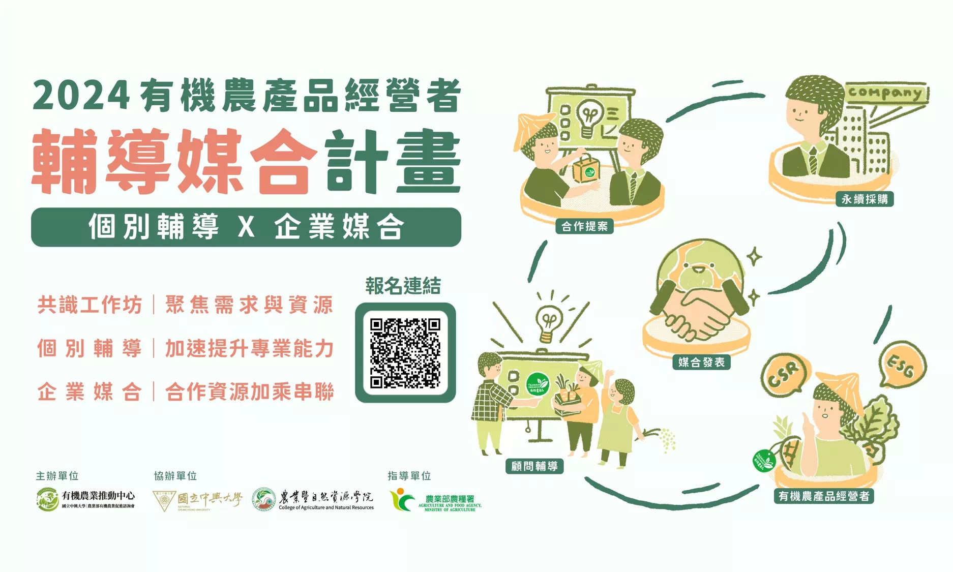 一、為促進有機農產品經營者與企業、通路或其他跨域單位合作,中興大學有機農業推動中心辦理「有機農產品經營者輔導媒合計畫」,包含共識工作坊、顧問個別輔導及媒合相關活動,敬邀有意與企業或通路合作之有機農產品經營者(通過臺灣有機農產品驗證之經營者)報名徵選。惠請公告活動訊息,並轉知所屬相關單位報名參加。