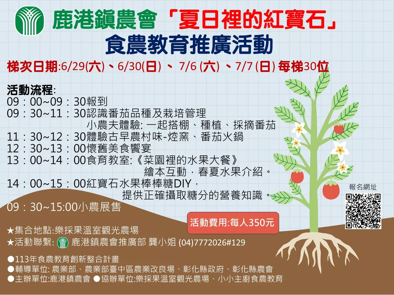 說明: 一、依據113年度食農教育創新整合計畫辦理。 二、活動梯次日期:6/29(六)、6/30(日)、7/6(六)、7/7(日)。 三、開放報名時間:113年6月3日上午10點。 四、活動報名請掃DM QR碼填資料報名。
