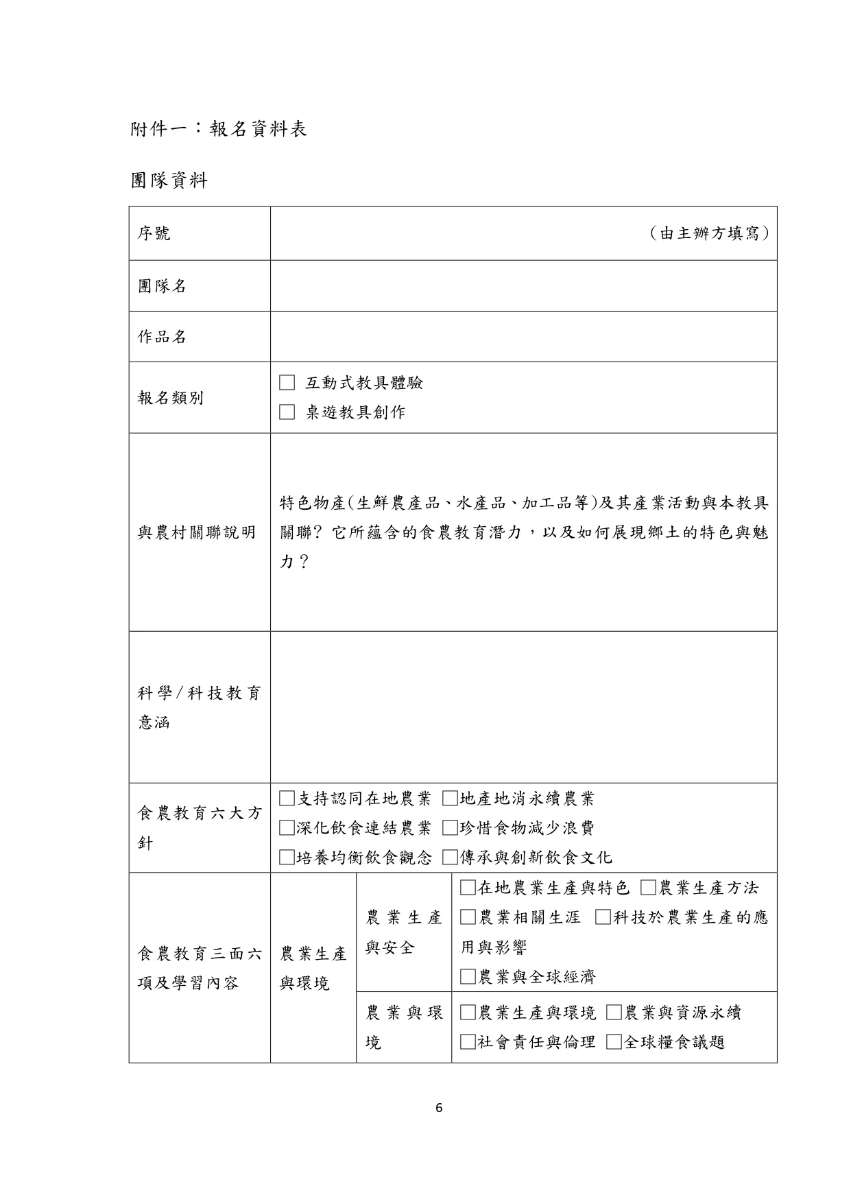 一、配合《食農教育法》頒布,為鼓勵大眾認識食農教育精神,規劃辦理食農教育創意教具競賽,徵選優秀作品作為展示及教具推廣使用,以達推動全民食農教育,強化飲食、環境與農業連結之目的。