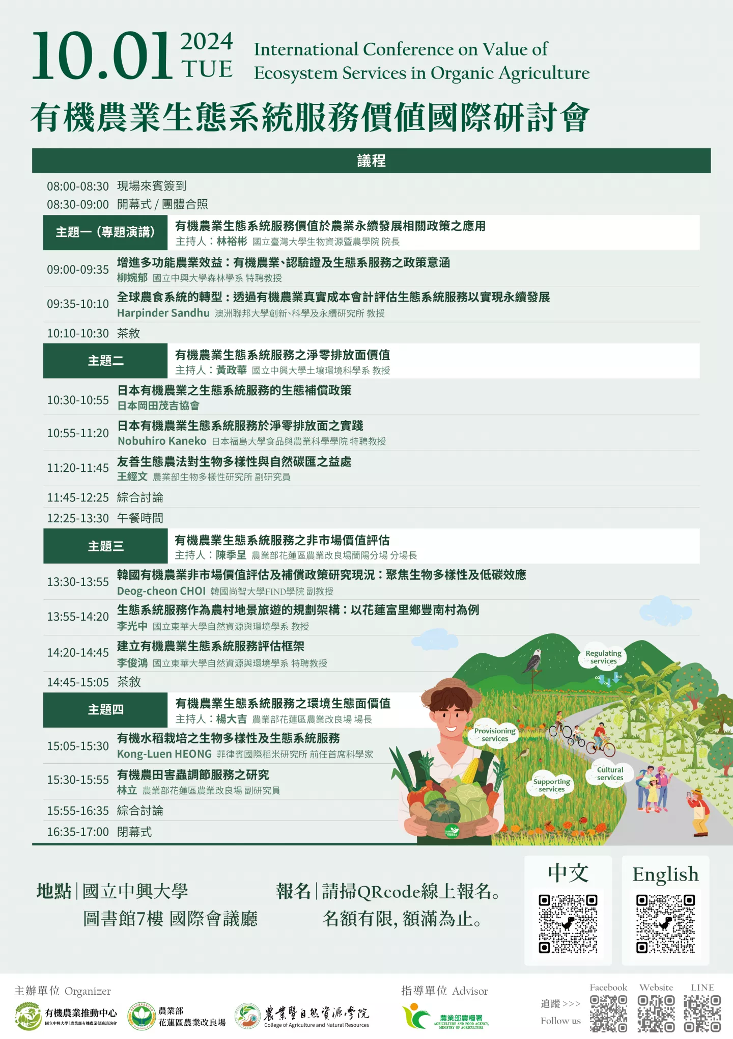一、旨揭研討會以「有機農業生態系統服務價值」為主題,邀集國內外專家學者一同探討其應用於永續農業發展政策、淨零排放效益、非市場價值發展潛力、生態價值等面向,藉此提升國際專家學者對我國有機農業相關研究的認識,同時汲取國際推行經驗,做為我國推行有機農業相關政策之參考,以及讓有機農產品經營者與企業夥伴了解有機農業的生態系統服務價值,誠摯邀請報名參加。