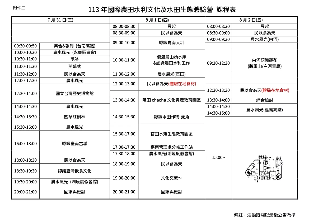 說明: 一、依據農業部農田水利署「113年度農田水利文化及水田生態教育推廣計畫」(113農水發-1.2-利-10)辦理。 二、活動時間為本(113)年7月31日(三)至8月2日(五)假臺南市舉行,課程表如附件二,活動配合款新臺幣2,500元整,俟錄取公文通知後於活動現場繳納。 三、本活動報名自即日起至7月25日(四)止,活動報名採線上報名(網址:https://4-h.me/pse5w),個資提供同意書簽立後於活動現場繳交。 四、活動聯絡窗口:廖瑋歆專員,02-23626021#20。